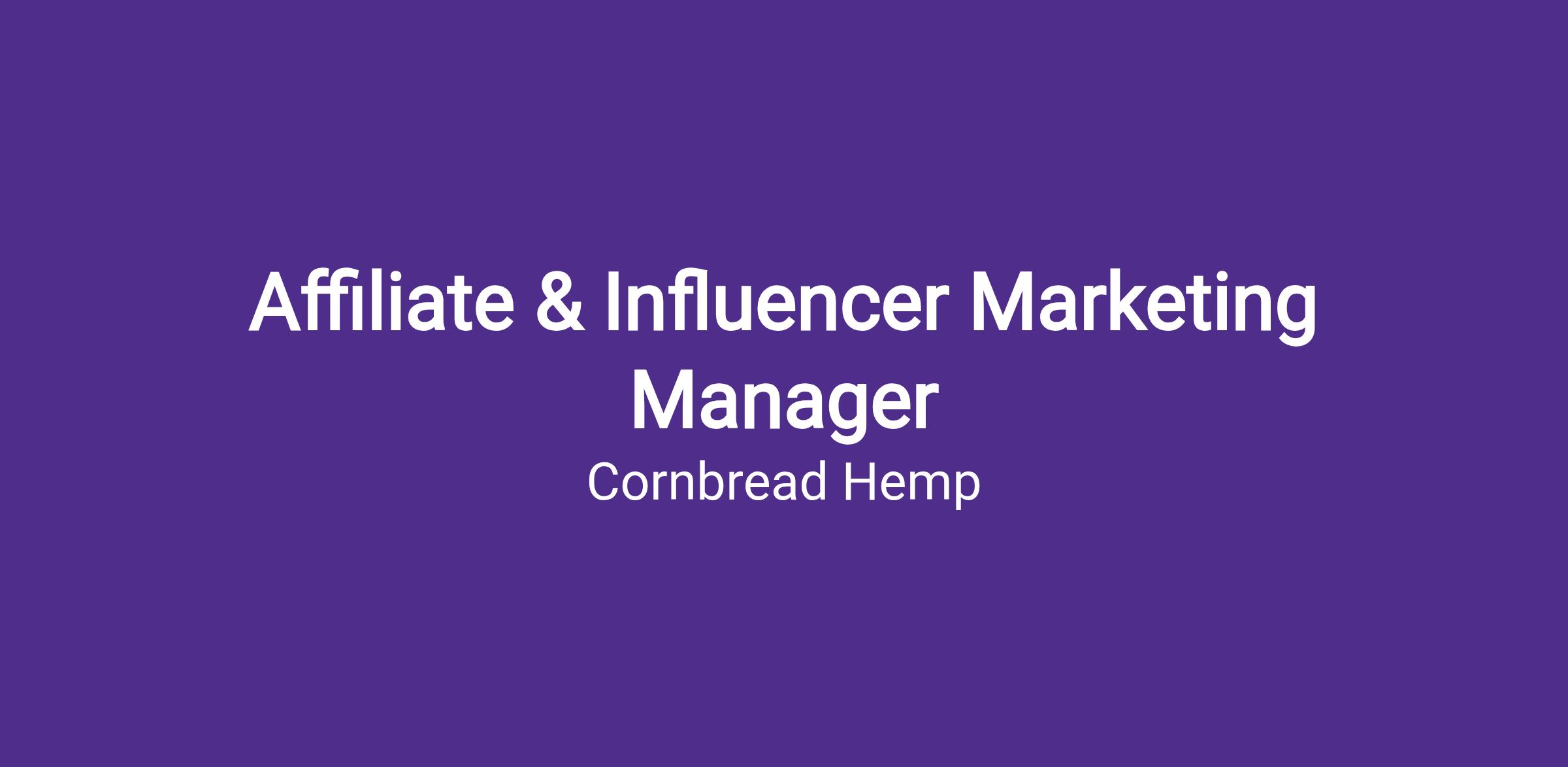 Cornbread Hemp is seeking a dynamic and results-driven Affiliate and Influencer Marketing Manager to join our lean (but growing) Growth Marketing team. This role is pivotal in expanding our brand reach through strategic affiliate marketing programs and influencer partnerships. The ideal candidate will have a keen understanding of the affiliate marketing and influencer marketing landscapes, is extremely data driven, possesses excellent time-management skills and attention to detail, and a creative approach to developing campaigns that drive engagement and revenue. This position will report directly to the Sr. Director of Growth Marketing.
