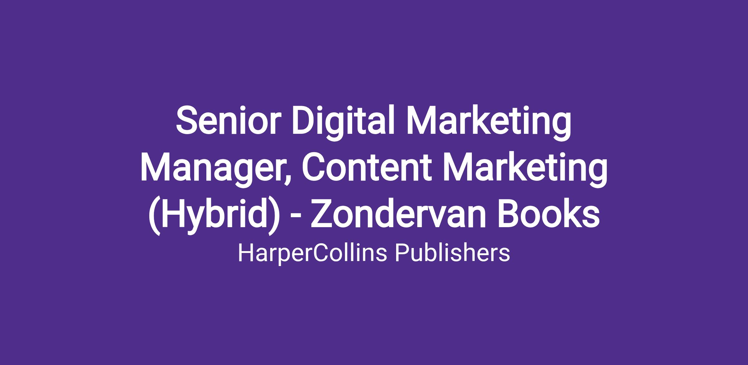 The Senior Digital Marketing Manager, Content Marketing plays a strategic role in planning and executing digital marketing programs for the Zondervan Books group, with a specific focus on content strategy and development that drives awareness and interest in our books. This role is responsible for identifying compelling reader-facing content opportunities, developing scalable content assets, and transforming long-form material—such as manuscripts, chapters, author interviews, and ideas—into high-performing content across digital platforms.