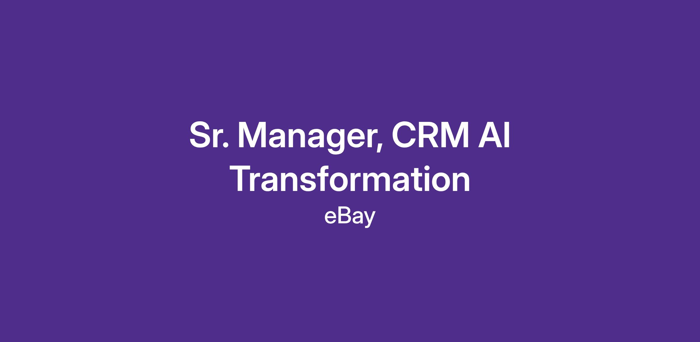 We're seeking a dynamic leader to transform how eBay delivers customer experiences through CRM. As Senior Manager, CRM AI Transformation, you will drive the vision for the next-generation CRM platform, systems, and processes. This is a newly crafted, strategic role reporting into the Director, CRM AI Transformation, with hands-on remit across Marketing, Data Science, Analytics, and MarTech.